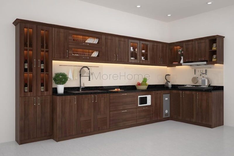 MoreHome thiết kế các mẫu tủ bếp gỗ óc chó để tạo nên không gian sang trọng, đẹp mắt với chất lượng gỗ cao cấp.