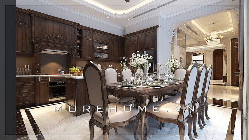 Phòng ăn được thiết kế theo phong cách tân cổ điển với sự kết hợp giữa nội thất gỗ tự nhiên cao cấp và sự sang trọng.